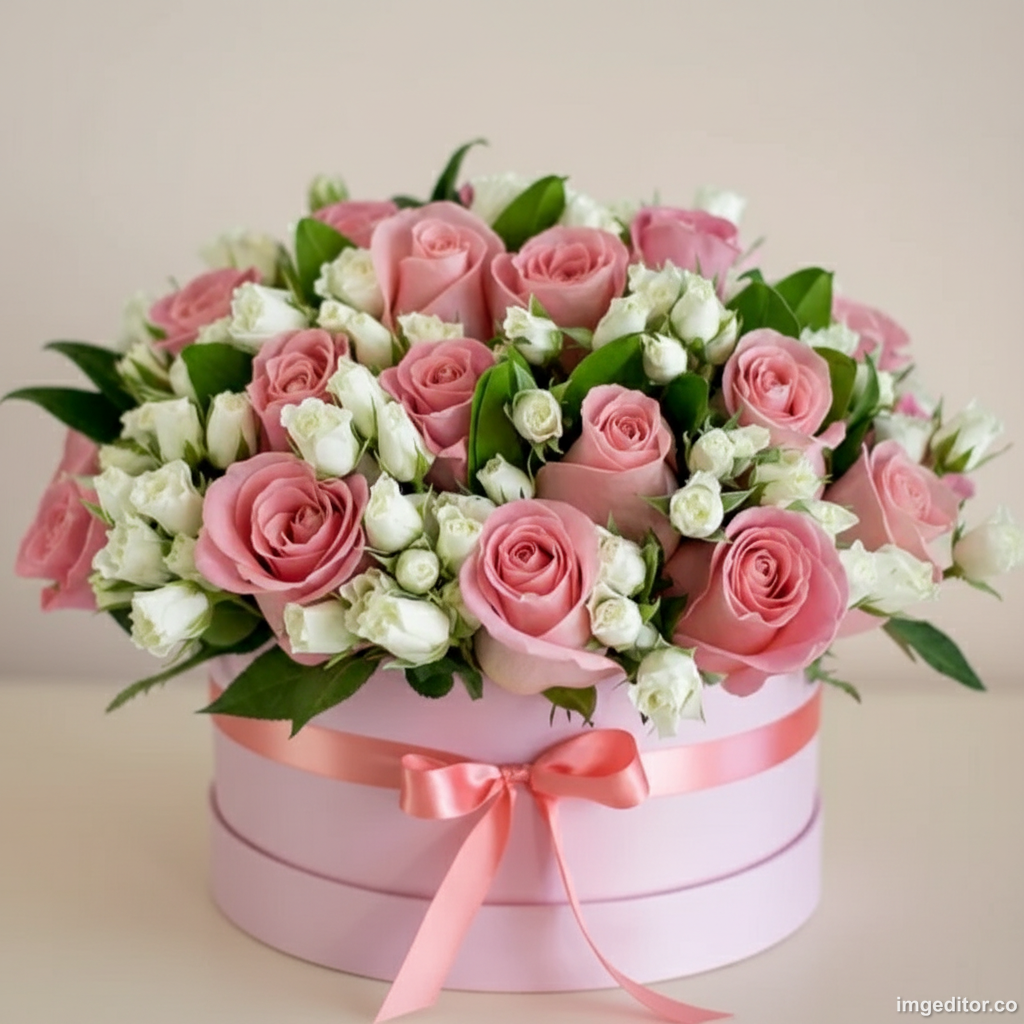 Pink Roses and White Spray Roses in Pink Round Box